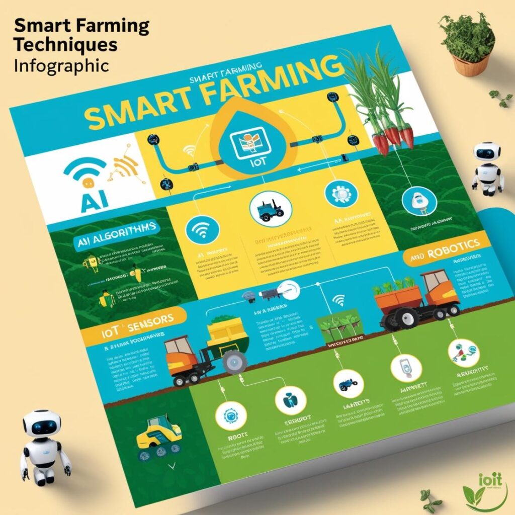 ### The Role of Artificial Intelligence in Farming AI is like having a super-smart assistant who never gets tired. It helps farmers tackle challenges like soil testing, weed control, and pest management. Imagine AI as a brain that processes vast amounts of data to provide precise solutions. #### AI Basics in Agriculture AI starts with machine learning, where data is fed into machines to make human-like decisions. For example, AI can predict weather patterns, helping farmers decide the best time to plant crops. It also includes chatbots to assist farmers with less tech experience and drones (UAVs) to monitor fields for issues like pest invasions. #### AI in Seed and Crop Selection Choosing the right seeds is vital for a good harvest. Traditionally, farmers relied on experience, but AI can analyze past data to recommend the best seeds for specific conditions. Tools like SeedGerm use AI to evaluate seed quality, ensuring high germination rates and better yields. #### AI in Crop Management AI can control growth conditions like light, humidity, and soil moisture. For instance, Trace Genomics uses AI to analyze soil DNA and recommend the best crops to plant. This precise control helps in optimizing resources and improving crop health. #### AI in Pest and Weed Management AI can also manage pests and weeds more efficiently. Automated machines can detect and spray only the affected areas, reducing chemical use and environmental impact. Systems like SMARTSOY and CORAC are great examples of this technology in action. ### The Role of the Internet of Things (IoT) in Farming IoT is like giving your farm a digital upgrade. It involves using sensors and devices to collect and analyze data, helping farmers make informed decisions. #### IoT-Based Soil Sampling IoT tools can monitor soil quality, preventing degradation and improving crop yields. For instance, the Lab-in-a-Box toolkit allows farmers to test soil samples easily, providing insights into water-holding capacity and nutrient levels. #### IoT in Remote Sensing Remote sensing with IoT can track soil moisture and predict droughts. Satellites like SMOS provide detailed soil moisture maps, helping farmers plan irrigation and manage water resources more effectively. ### Robotics in Advanced Farming Robots in farming? Yes, you heard it right! Robots are becoming essential in modern agriculture, performing tasks like planting, weeding, and harvesting with precision. #### Robots in Crop Management Robots equipped with sensors can manage crops by controlling growth conditions and automating tasks like irrigation. This reduces labor and ensures optimal crop health. #### Robots in Harvesting and Storage Robots can also help with harvesting and storing crops. They ensure that produce is handled carefully, maintaining quality and reducing waste. ### Actionable Tips - Integrate AI for Better Decisions: Use AI tools to analyze soil and crop data for informed farming decisions. - Utilize IoT for Monitoring: Implement IoT devices to monitor soil moisture and weather conditions. - Adopt Robotics for Efficiency: Invest in robotic systems for tasks like planting, weeding, and harvesting to save time and labor. ### Conclusion To wrap up, here's a quick summary of how AI, IoT, and robotics can boost your farming: - AI: Enhances decision-making, seed selection, crop management, and pest control. - IoT: Monitors soil and environmental conditions, aiding in efficient resource management. - Robotics: Automates tasks, ensuring precision and reducing labor. These technologies are not just futuristic concepts—they're here now, transforming agriculture into a more efficient and productive industry. So, embrace these smart technologies and take your farming to the next level! For your Instagram reels or Canva infographics: - Highlight the importance of AI, IoT, and robotics in farming. - Break down AI applications: seed selection, crop management, pest control. - Showcase IoT benefits: soil monitoring, remote sensing. - Illustrate robotics in action: planting, weeding, harvesting. - Use engaging visuals and concise text to capture attention and inform your audience. ### IoT-Based Disease and Pest Monitoring Farmers can significantly reduce pesticide usage by utilizing IoT-based smart devices, such as wireless sensors, drones, and robots, to accurately identify crop pests. Modern IoT-based pest management offers real-time monitoring, disease forecasting, and modeling, making it more effective than traditional pest control methods. Cutting-edge pest and disease detection techniques rely on image processing, with raw images collected across the farming region using remote sensing satellites or field sensors. Remote sensing imagery typically covers large areas and is cost-effective. Field sensors can perform more functions in data collection, such as environmental sampling, plant condition monitoring, and pest threat assessment at every stage of the crop cycle. IoT-based automatic traps can collect, count, and even describe pest varieties, then upload the data to the cloud for detailed analysis. This IoT-based pest monitoring system can minimize total costs and assist in restoring the natural climate. ### 1.3.3 IoT-Based Fertilization New IoT-based fertilization technologies facilitate accurate estimation of spatial patterns of fertilizer requirements with minimal labor. For example, the normalized difference vegetation index (NDVI), based on the reflection of visible and near-infrared light from vegetation, examines crop nutrition status using satellite images and measures crop health, vegetation vigor, and density. It also helps analyze soil nutrient levels. Such precise execution can significantly boost fertilizer efficiency while avoiding environmental side effects. Geo-mapping, GPS accuracy, autonomous vehicles, and variable rate technology (VRT) contribute to IoT-based smart fertilization. Other IoT benefits include fertigation and chemigation. ### 1.3.4 IoT-Based Yield Mo