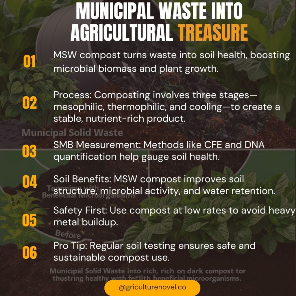 ### Summary: Key Takeaways for Creating Instagram Reels or Canva Infographics - Intro: MSW compost turns waste into soil health, boosting microbial biomass and plant growth. - Process: Composting involves three stages—mesophilic, thermophilic, and cooling—to create a stable, nutrient-rich product. - Soil Benefits: MSW compost improves soil structure, microbial activity, and water retention. - SMB Measurement: Methods like CFE and DNA quantification help gauge soil health. - Safety First: Use compost at low rates to avoid heavy metal buildup. - Pro Tip: Regular soil testing ensures safe and sustainable compost use. With the right approach, MSW compost can become a valuable resource in sustainable agriculture, helping farmers enhance soil health while reducing waste.