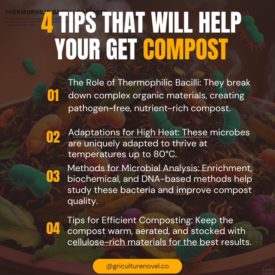### How Do We Study These Bacteria? Techniques in Microbial Analysis Uncovering the diversity of microbes in compost is no simple task. Various scientific methods have been developed to study these bacterial communities, each offering insights into their behavior, composition, and succession during composting. #### 1. Enrichment Methods Enrichment is like “microbial matchmaking.” Scientists adjust the compost’s nutrients to cultivate specific bacterial groups. This technique helps isolate Bacilli and monitor their effect on compost quality. #### 2. Biochemical Analysis Using methods like Community Level Physiological Profiling (CLPP), scientists evaluate how Bacilli utilize different nutrients. By analyzing their metabolic capabilities, researchers can identify the functional potential of various microbes in compost. #### 3. Molecular Approaches: Peering into DNA With molecular tools, researchers analyze DNA sequences to identify and monitor microbial communities. Key methods include: - Guanine-Cytosine Content Analysis (G + C): Determines species diversity based on DNA composition. - Nucleic Acid Hybridization: This involves tagging DNA to identify specific microbial communities, which aids in tracing microbial succession. - DNA Re-association and T-RFLP: These techniques assess diversity by examining DNA fragment patterns, helping determine which microbes dominate at different composting stages. ### Making the Most of Thermophilic Bacilli in Composting Knowing how thermophilic Bacilli function helps us optimize compost quality, but it also offers actionable insights for farmers and gardeners: - Maintain Warmth: Thermophilic Bacilli work best in temperatures between 55°C and 80°C. Keeping compost warm by ensuring a large compost pile or insulating it during colder months can encourage these bacteria. - Aerate Regularly: These bacteria thrive in oxygen-rich environments, so turning the compost pile helps them flourish. - Add Cellulose-Rich Materials: Grass clippings, leaves, and shredded paper provide cellulose, a favorite food for cellulase-producing Bacilli, ensuring compost matures faster. ### In Summary: Thermophilic Bacilli’s Power in Composting To make the most of these incredible heat-loving bacteria, here’s what we’ve covered: - The Role of Thermophilic Bacilli: They break down complex organic materials, creating pathogen-free, nutrient-rich compost. - Adaptations for High Heat: These microbes are uniquely adapted to thrive at temperatures up to 80°C. - Methods for Microbial Analysis: Enrichment, biochemical, and DNA-based methods help study these bacteria and improve compost quality. - Tips for Efficient Composting: Keep the compost warm, aerated, and stocked with cellulose-rich materials for the best results. By understanding and working with thermophilic Bacilli, we don’t just speed up composting; we transform it into an eco-friendly, nutrient-rich process for better farming and a healthier planet. Pyrosequencing Pyrosequencing is a DNA sequencing method that detects nucleotide incorporation by identifying pyrophosphate release. This technique, which does not require labeled nucleotides or primers and avoids electrophoresis, offers high accuracy and efficiency in sequencing large sample sets. It is particularly useful in analyzing bacterial diversity by overcoming the limitations of studying small sample numbers. 6.3.4.9 Illumina-based High Throughput Microbial Community Analysis Illumina technology uses DNA clustering on slides, incorporating reversible terminator bases (RT-bases) for sequencing. It supports both single and paired-end libraries, which facilitates high-resolution genome sequencing, structural variation detection, and efficient sequence assembly, making it versatile for microbial community analysis. 6.4 Role of Thermophilic Bacilli in Composting Composting is categorized into hot and cold types, with hot composting preferred for its speed and control. Hot composting proceeds through three phases: - Mesophilic Phase (~40°C): Rapid breakdown of easily degradable substrates by mesophiles. - Thermophilic Phase (55–80°C): Lasting several days, this phase is characterized by the presence of thermophilic bacteria like Bacilli, which break down complex substrates and reduce pathogens. - Curing Phase: Mesophiles dominate this phase, which involves the slow degradation of remaining organic matter, resulting in humus. Thermophilic Bacilli play a key role throughout all stages, thriving in both moderate and high temperatures and efficiently decomposing diverse organic compounds. 6.5 Spectrum of Thermophilic Bacilli Thermophilic Bacilli are common in various compost types. Studies have identified strains like Bacillus licheniformis, B. thermodenitrificans, Geobacillus, Ureibacillus, and Anureinibacillus across different compost settings. These Bacilli dominate especially during the thermophilic phase and vary by compost type (e.g., garden, municipal waste). Techniques like ARDRA, DGGE, FISH, and 16S rRNA gene sequencing have helped characterize these microbial communities, highlighting the Bacilli's vital role in organic matter degradation and compost maturation. Pyrosequencing Pyrosequencing is a DNA sequencing method that determines nucleotide sequences based on the “sequencing by synthesis” principle, where the addition of each nucleotide releases pyrophosphate (PPi). Unlike traditional Sanger sequencing, which uses dideoxynucleotides for chain termination, pyrosequencing leverages the release of pyrophosphate to detect nucleotide incorporation, eliminating the need for labeled nucleotides or primers. This approach allows rapid, high-throughput sequencing without requiring electrophoresis, making it a powerful tool for bacterial diversity studies. Pyrosequencing enables analysis across extensive sample sets, thus overcoming the limitations of methods that require analyzing a smaller number of clones or fewer samples. This capacity has made pyrose