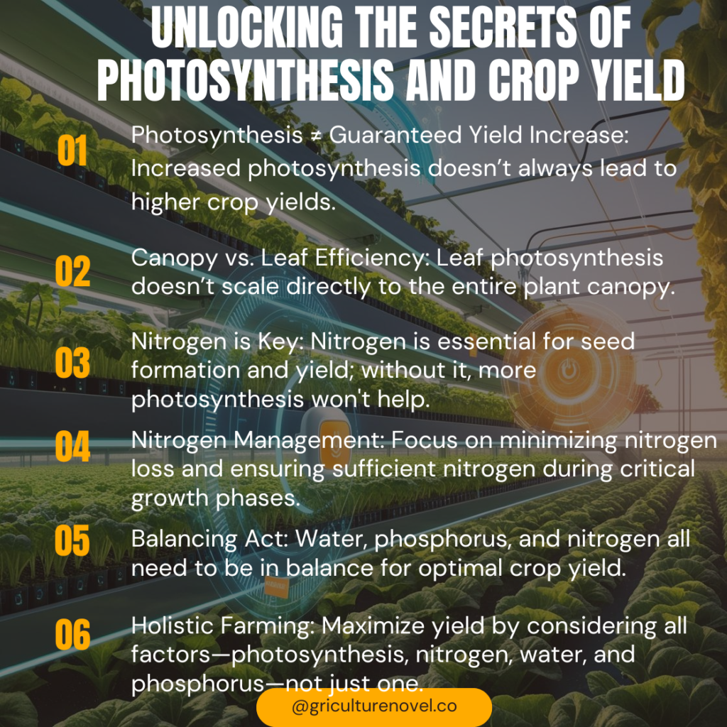 Photosynthesis—the process by which plants capture sunlight and convert it into energy—seems like the magic bullet for increasing crop yield, right? After all, if a plant could photosynthesize more, it should grow more. But as simple as that sounds, this theory doesn't always hold up in practice. Many studies have shown that increasing a plant's photosynthetic rate doesn’t always lead to a proportional boost in yield. Why is that, you ask? Let’s dig into the details and unravel the science behind photosynthesis and its relationship with crop production. ### The Photosynthesis-Yield Puzzle At first glance, the idea that increasing leaf photosynthesis should increase crop yield seems logical. Carbon, derived from photosynthesis, makes up around 40% of a plant's dry weight, so boosting the amount of carbon should lead to bigger, more productive plants. However, research shows that the correlation between photosynthesis and yield isn’t as clear-cut. Only a few studies have found a direct link between higher photosynthesis rates and improved yields, and even those are highly context-specific. In fact, a broad review of field evaluations suggests that there's little to no consistent relationship between a crop's photosynthesis rate and its yield potential. So why doesn’t more photosynthesis automatically mean more yield? Let’s break it down.      ### Leaf Photosynthesis vs. Canopy Carbon Accumulation One key reason why increased leaf photosynthesis doesn’t always translate into higher yields is that the total carbon assimilation at the canopy level (where multiple leaves work together) doesn't increase in a simple, linear fashion. This diminishing return occurs because leaves in the lower parts of the canopy receive less sunlight than those at the top, reducing the overall efficiency of carbon capture. The "Radiation Use Efficiency" (RUE) measures how effectively a plant converts sunlight into biomass. While individual leaves may have high photosynthesis rates, their combined canopy-level contribution doesn’t scale up as you might expect. This inefficiency has been noted in crops like soybeans and cereals, which, despite impressive individual leaf photosynthesis, don’t achieve equally impressive overall carbon gains. ### The Role of Nitrogen in Seed Yield Another critical factor limiting yield increases is nitrogen, not carbon. Nitrogen is essential for plant growth and development, especially when it comes to seed formation. While carbon provides the bulk, nitrogen is like the glue that holds everything together, facilitating processes like protein synthesis, cell division, and ultimately, seed development. Experiments have shown that even a 50% increase in the molecular capacity for photosynthesis (like boosting Rubisco RNA) only leads to modest gains in overall plant mass and seed yield. Why? Because without enough nitrogen, the plant can't efficiently convert all that extra carbon into productive seed mass. In fact, if nitrogen levels are insufficient, boosting photosynthesis might actually decrease yield by leading to early growth that uses up limited nitrogen resources. ### Managing the Nitrogen Challenge The real bottleneck in increasing crop yields isn’t just how much carbon a plant accumulates but how well it can acquire and use nitrogen. The historical data is clear: before synthetic nitrogen fertilizers became widely available, crop yields were far lower. Since nitrogen is often lost to the environment through leaching and denitrification, only about 40% of applied nitrogen fertilizer is actually taken up by the plant. So, achieving the high nitrogen levels needed for optimal yield can be both expensive and environmentally challenging. Balancing nitrogen inputs and minimizing losses while ensuring plants have enough nitrogen at critical growth stages is key to improving yield. Without resolving these issues, focusing solely on carbon accumulation won't unlock the full yield potential of crops. ### Other Factors: Water and Phosphorus While nitrogen is a major limiting factor, it's not the only one. Water and phosphorus availability also play critical roles. For crops to reach their maximum yield potential, all these elements—carbon, nitrogen, water, and phosphorus—must be in balance. Any limitation in one of these areas can prevent crops from achieving higher yields, even if photosynthesis rates are optimized. ### Actionable Takeaways for Farmers and Enthusiasts - Don't Focus Solely on Photosynthesis: Boosting photosynthesis rates might not directly translate into higher yields. Consider a holistic approach that includes nitrogen management. - Optimize Nitrogen Usage: Effective nitrogen management is crucial for increasing seed yield. This includes ensuring proper nitrogen availability at critical growth stages and minimizing losses through leaching. - Balance Water and Nutrient Inputs: Nitrogen, water, and phosphorus are interlinked. A lack of any one of these can limit yield even if photosynthesis and carbon accumulation are optimized. - Beware of Diminishing Returns: Simply increasing leaf photosynthesis won’t result in proportional gains in yield due to inefficiencies at the canopy level. ### Summary for Infographics: - Photosynthesis ≠ Guaranteed Yield Increase: Increased photosynthesis doesn’t always lead to higher crop yields. - Canopy vs. Leaf Efficiency: Leaf photosynthesis doesn’t scale directly to the entire plant canopy. - Nitrogen is Key: Nitrogen is essential for seed formation and yield; without it, more photosynthesis won't help. - Nitrogen Management: Focus on minimizing nitrogen loss and ensuring sufficient nitrogen during critical growth phases. - Balancing Act: Water, phosphorus, and nitrogen all need to be in balance for optimal crop yield. - Holistic Farming: Maximize yield by considering all factors—photosynthesis, nitrogen, water, and phosphorus—not just one. By understanding and addressing these underlying factors, farmer