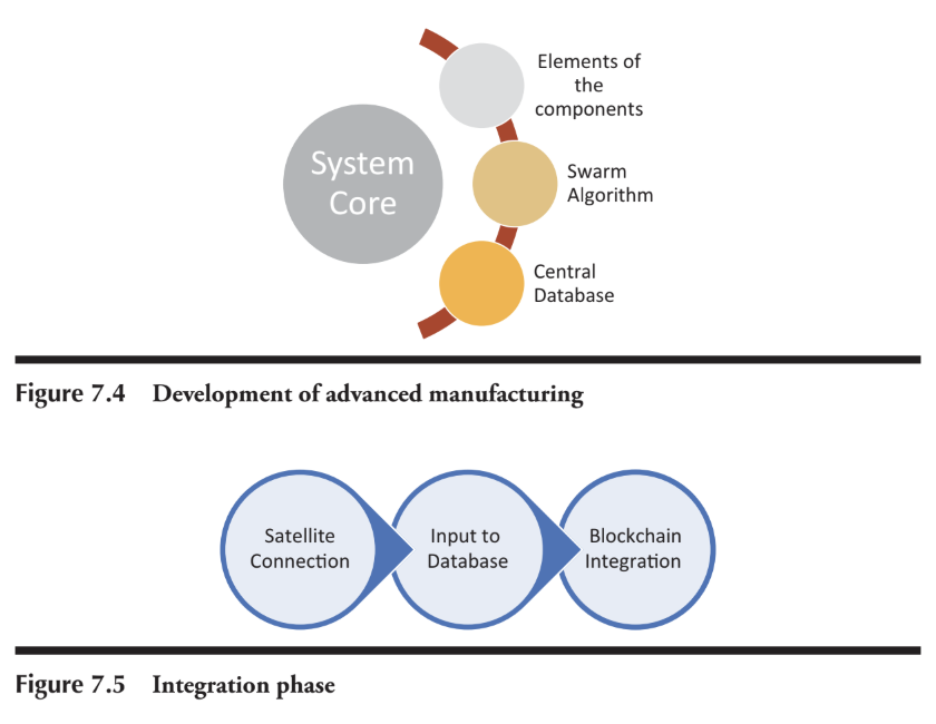 \n\n\n\nFigures 7.4 and 7.5 show the components and integration phase of the advanced manufacturing system, including swarm algorithms, blockchain integration, and satellite connectivity.