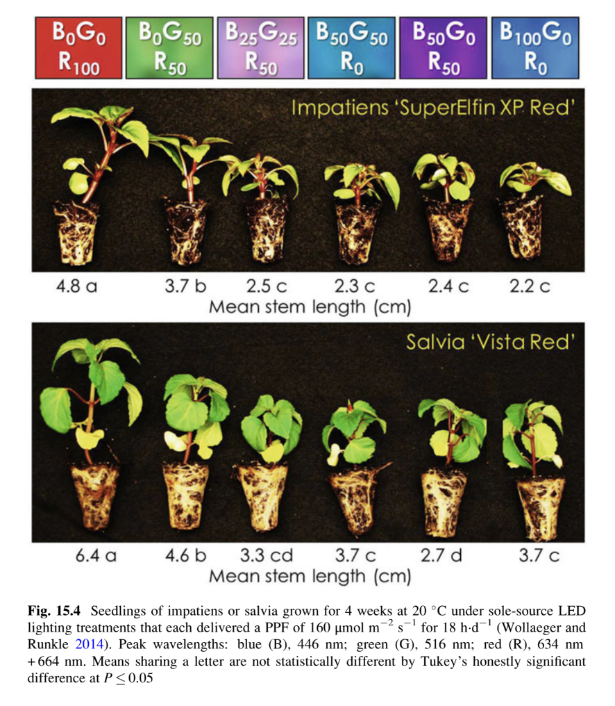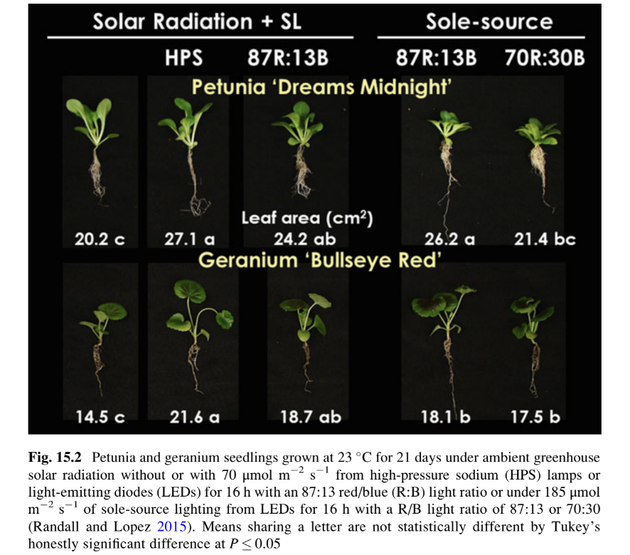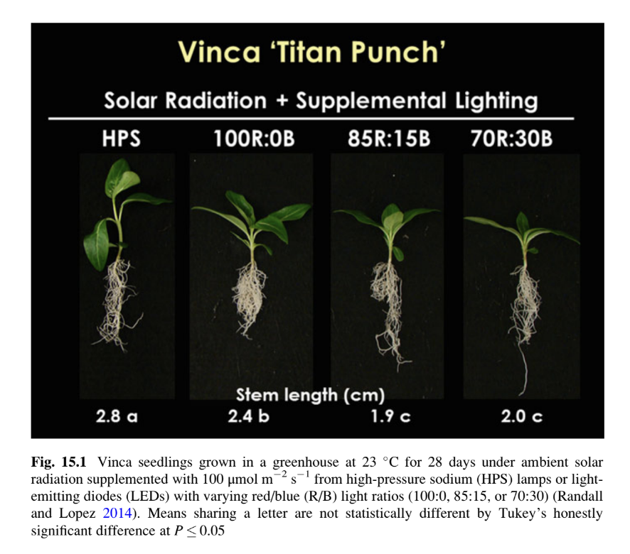 - Blue and Red Light in Seedling Growth: Studies on tomato and bedding plants, like petunias and geraniums, under various red/blue LED light ratios (e.g., 70:30, 85:15) in greenhouses showed that blue light had limited impact on seedling morphology due to the ample sunlight. However, sole-source LED lighting (without solar input) resulted in more compact plants with increased root mass, darker foliage, and improved space efficiency. \n\n\n\n