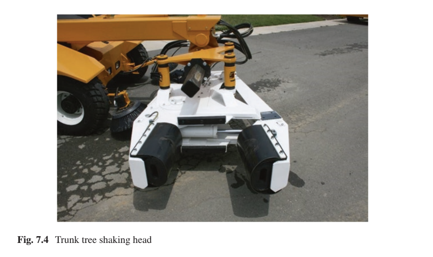 - Trunk Shaking (Indirect Detachment): A clamp applies shaking to the tree trunk, transferring energy through branches and inducing relative motion in the fruit. Skilled operators adjust amplitude and frequency to maximize fruit detachment while minimizing damage. \n\n\n\n