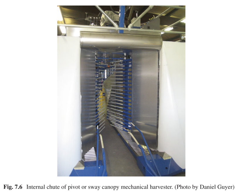 - Mechanical Efficiency: Canopy shaking is common, using bow-rod or sway-bar harvesters. This method is suitable as processing damages grapes anyway. \n\n\n\n
