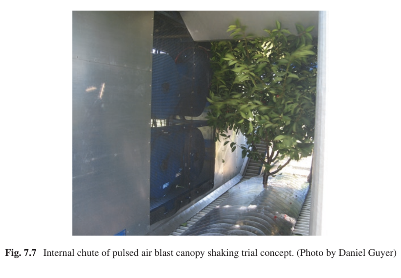 - Current Methods: Large spindle-tine machines perform canopy shaking, with setups that can handle larger trees with two machines working from opposite sides. \n\n\n\n