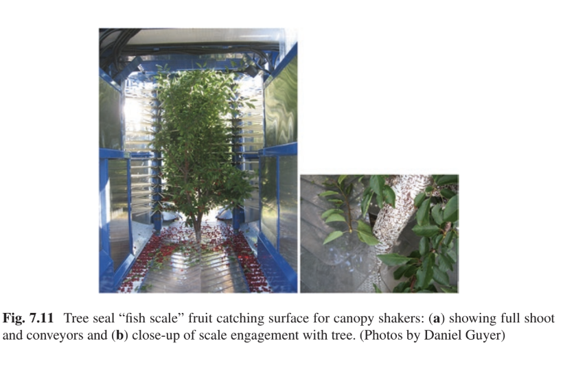- Fish Scale Catching Surface: Used in canopy shaking systems, overlapping Lexon or nylon plates form a tree seal to catch fruit, reducing loss while providing continuous operation, though adjustments are needed on slopes. \n