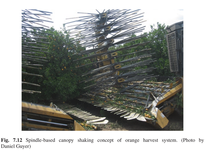 - Alternative: Smaller trees use single over-the-row spindle-tine machines, sometimes shaking fruit to the ground for later collection. \n