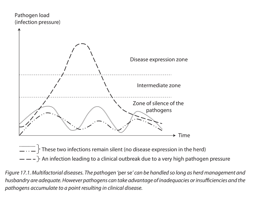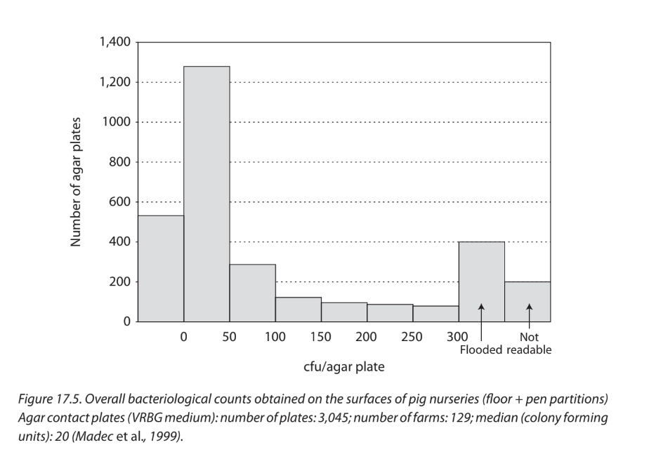 \n\n\n\nFor example, a study on 129 pig nurseries showed a range of bacterial counts, as illustrated in Figure 17.5, demonstrating how different factors impact surface contamination levels (Madec et al., 1999).
