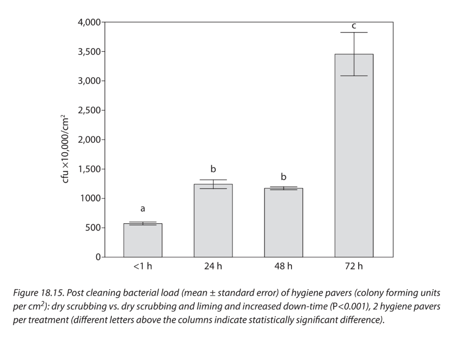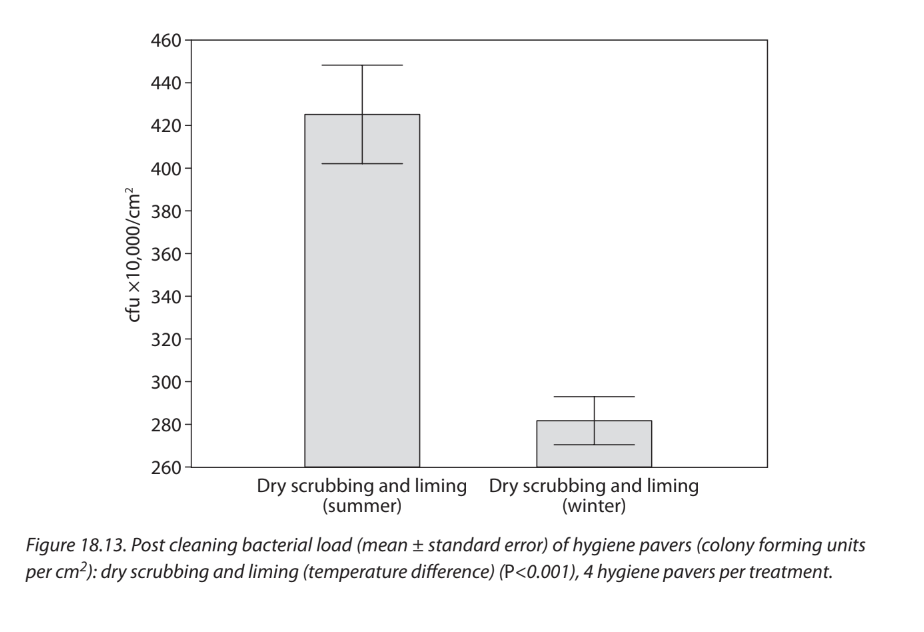 - Result: Hygiene pavers kept at a higher temperature (37 °C) showed significantly higher bacterial loads (425×10^4 cfu/cm²) compared to those cooled at 8 °C (281×10^4 cfu/cm²) after dry scrubbing and lime treatment (P<0.001). This indicates that warmer conditions can promote bacterial activity under thick lime applications, creating a moist microenvironment conducive to growth. \n