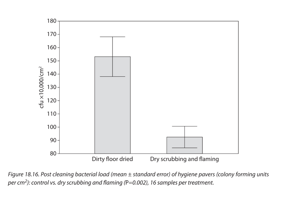 - Result: Flaming reduced bacterial loads significantly compared to untreated floors, though additional improvements in technique may be required to optimize heat transfer for maximal cleanliness. \n