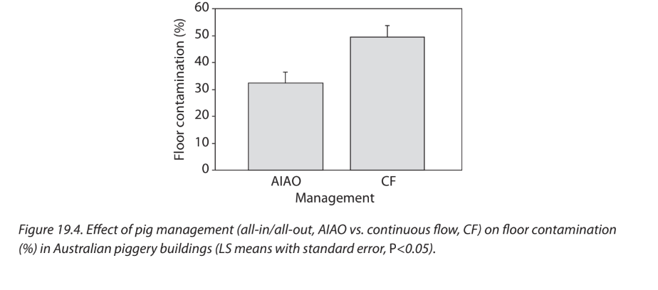 - Continuous flow (CF) buildings showed higher floor contamination (49%) compared to the all-in/all-out (AIAO) systems (32%). \n\n\n\n