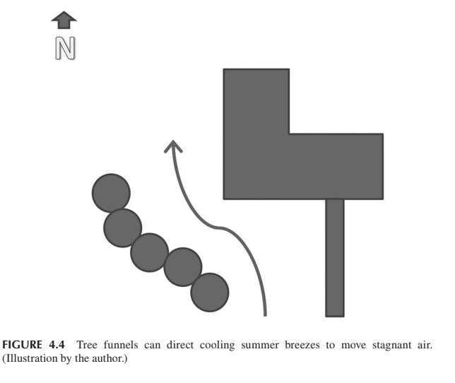 - Tree funnels are lines of trees positioned to guide the breeze through a specific area, ideally from a southwest to northeast direction. This method directs fresh air to the north side of a house, reducing stagnant air and promoting natural cooling. \n