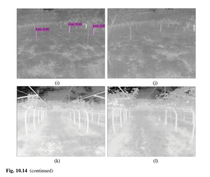 \n\n\n\nThermal cameras are ideal for detecting objects in low-light conditions because they sense temperature rather than visible light. In orchards, where tree branches block sunlight and global navigation satellite system (GNSS) signals, thermal cameras offer a unique advantage. They can recognize tree trunks across varied lighting conditions—whether during the bright afternoon or at dusk—making them reliable for guiding robots in orchards.