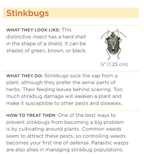 - Treatment: Control weeds to prevent attracting stinkbugs. Parasitic wasps can help manage populations. \n