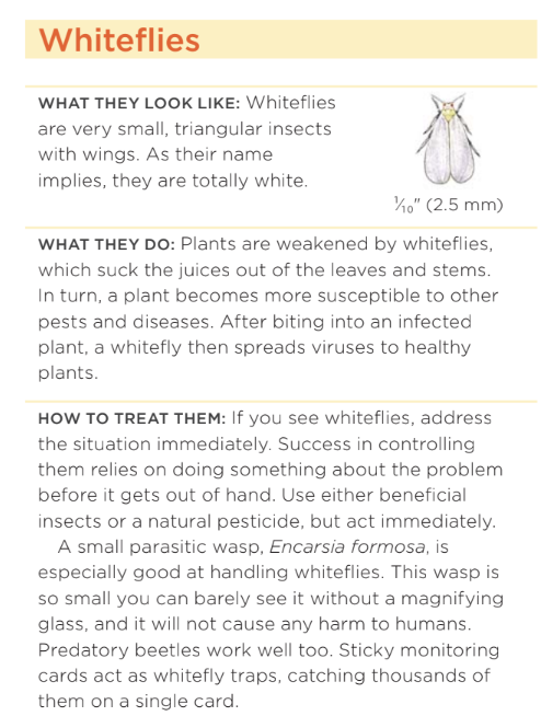 - Treatment: Act immediately by using beneficial insects like Encarsia formosa (parasitic wasp) or predatory beetles. Sticky cards trap whiteflies effectively. Soap, garlic sprays, or neem oil can also help, but severe infestations may require removing the plant. \n