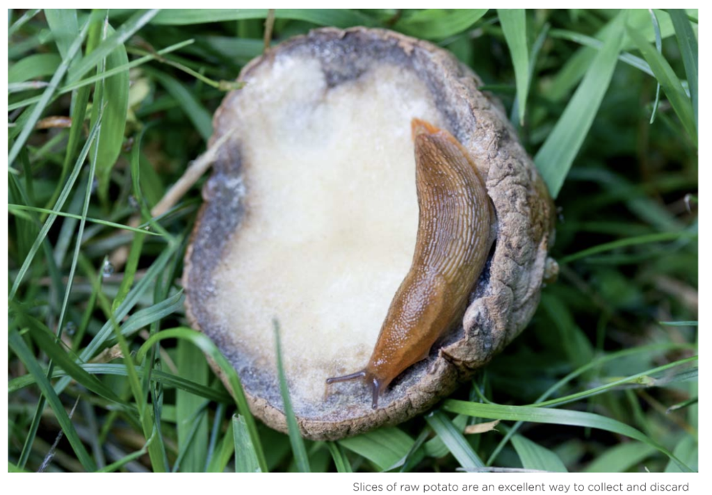- Slug and Snail Bait: Place raw potato slices to trap slugs, collect them early in the morning. Alternatively, pelletized bait can be sprinkled in affected areas. \n